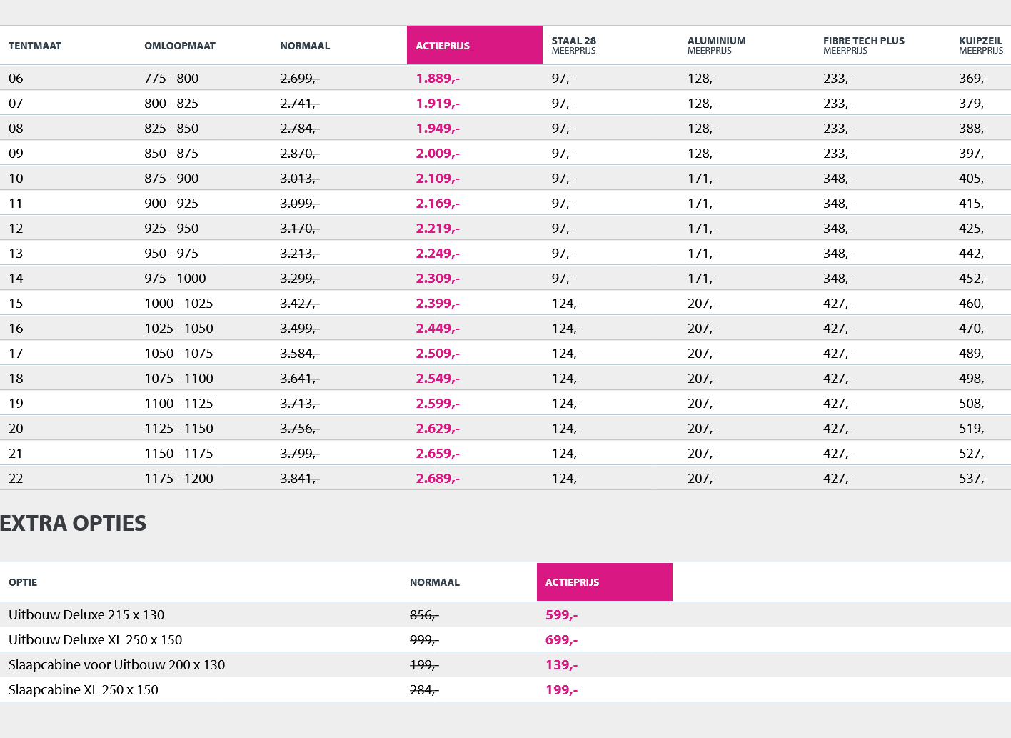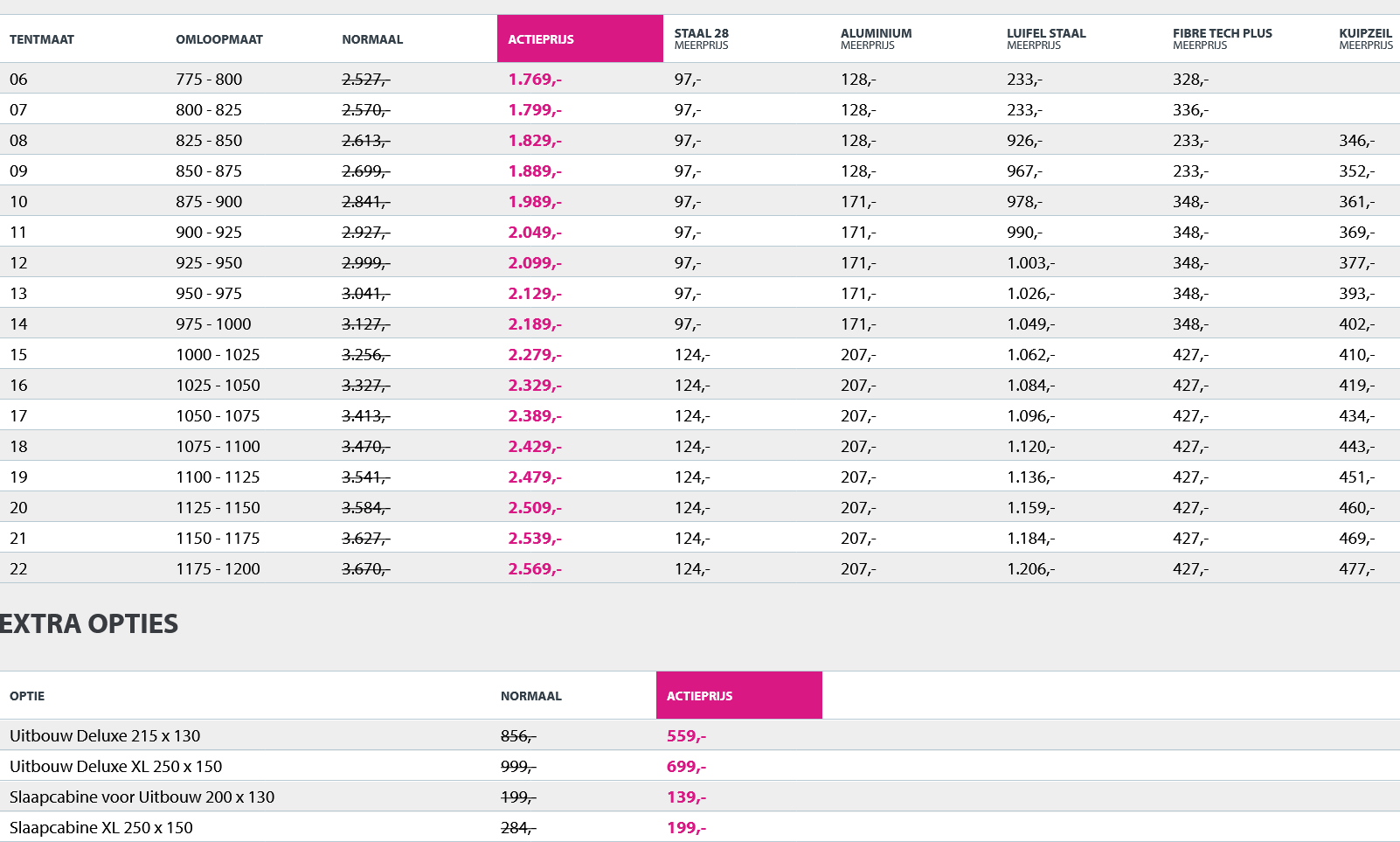 Frame: 25 mm EasyGrip staal (incl. petluifel stangen), Dubbele pinnen in de petluifel voor eenvoudig uitspannen, 2 extra dakliggers bij mt. 10 – 22, 2 extra staanders bij mt. 15 – 22