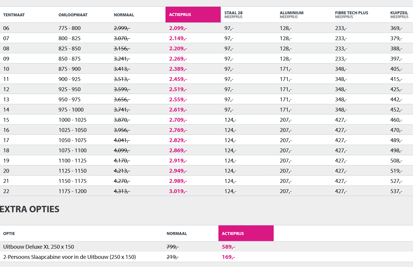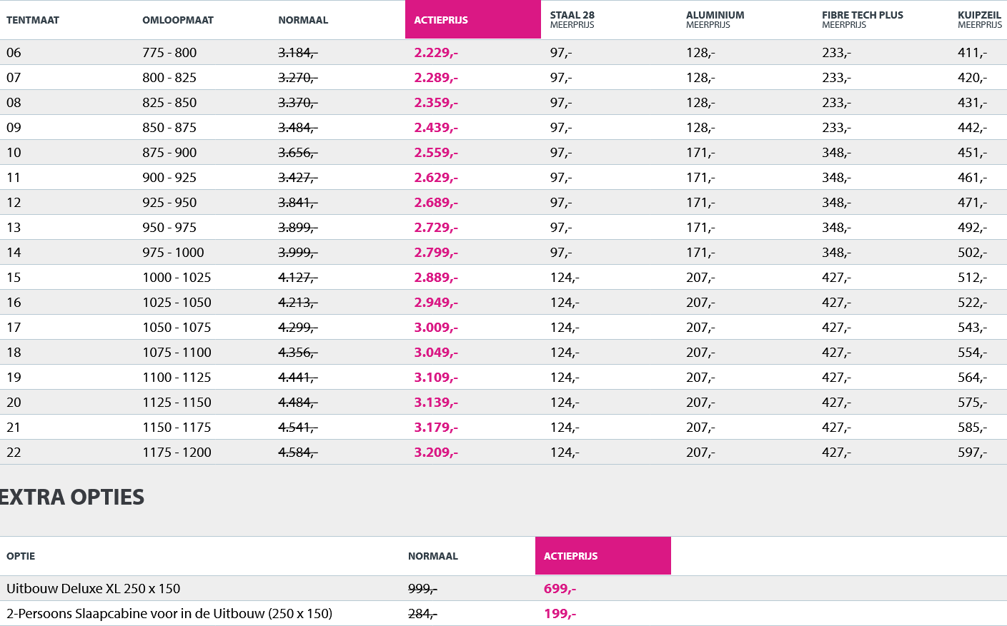 Frame:25 mm EasyGrip staal (incl. petluifel stangen), Dubbele pinnen in de petluifel voor eenvoudig uitspannen, 2 extra dakliggers bij mt. 10 – 22, 2 extra staanders bij mt. 15 – 22